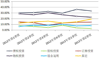 图3 2012年第1季~2013年第2季集合信托产品运用方式占比